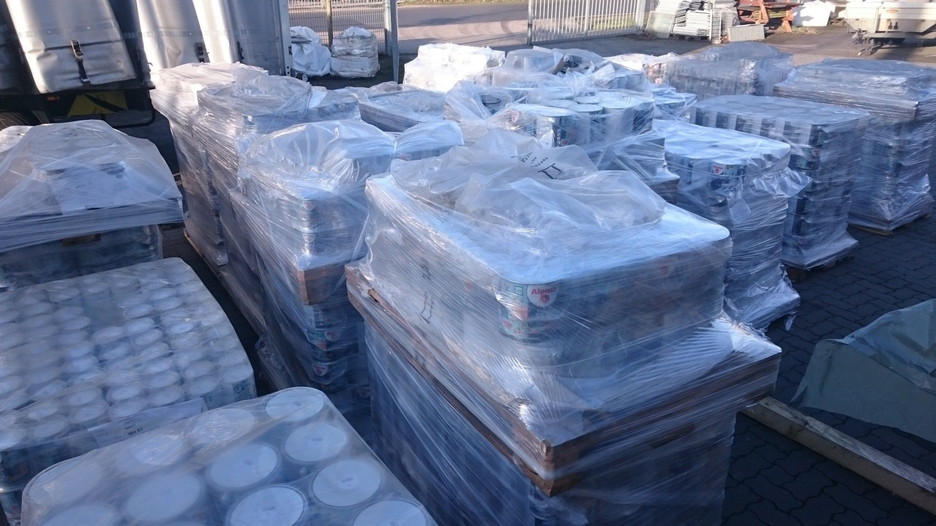 Jede Palette ist hochgepackt, das Paletten Gewicht beträgt ca.900 KG .