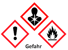 GHS 02: Sind entzündbar; Flüssigkeiten bilden mit Luft explosionsfähige Mischungen; erzeugen mit Wasser entzündbare Gase oder sind selbstentzündbar. Von offenen Flammen und Wärmequellen fernhalten; Gefäße dicht schließen; brandsicher aufbewahren.